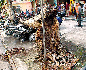 廣州東山區(qū)竹絲崗四馬路一棵七層樓高、重千余斤的老樹被一陣大風(fēng)刮倒,當(dāng)時正在樹旁邊聊天的六位市民嚇了一跳,快速向兩邊跑散開去。“哇!好險!”目瞪口呆地望著大樹將下邊一排摩托車壓個正著,目擊者陳先生的頭皮一陣發(fā)麻。